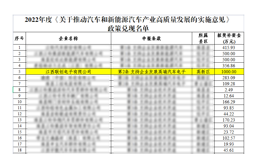 为抢抓新一轮新能源汽车乐鱼online(中国)发展机遇,加快建设具有南昌特色的现代化乐鱼online(中国)体系,2023年12月,2022年度《关于推动汽车和新能源汽车乐鱼online(中国)高质量发展的实施意见》政策拟兑现名单公示,江西乐鱼online(中国)有限公司榜上有名,获得发展高端汽车电子1000万元奖补资金,成为南昌市唯一一家获顶额奖补的企业。