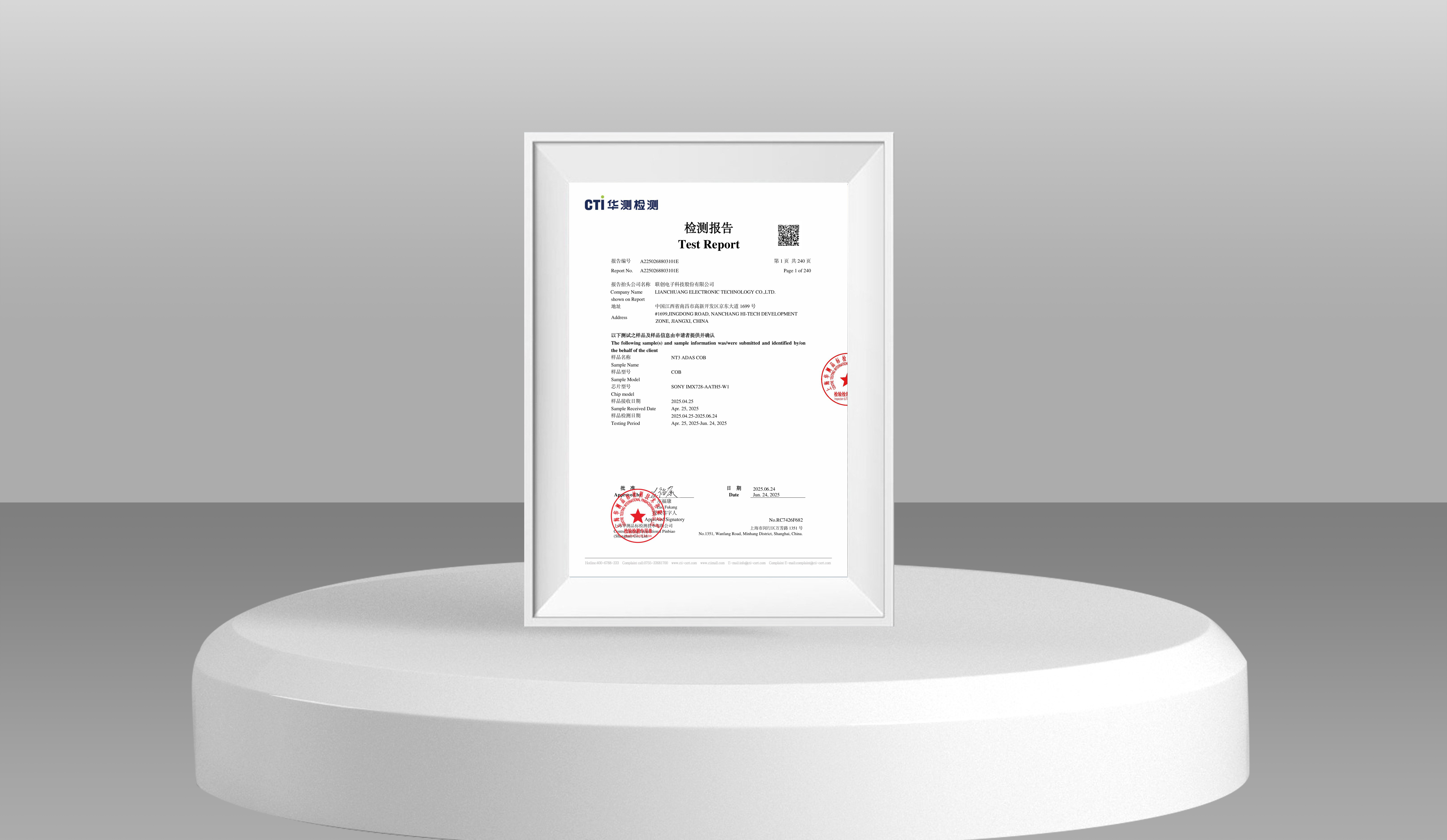 相较于传统BGA工艺,本次通过认证的COB封装技术展现出显著性能优势。采用外购晶圆自主封装模式,交付周期相比依赖封测厂产出的传统方式缩短1至2个月;封装精度由SMT工艺的100微米级提升至COB工艺的10微米级,图像采集更加稳定;芯片粘接面积更大,热传导性能更强,散热表现优异;同时结构上实现Sensor与PCBA面接触一体式封装,在满足小型化趋势的同时兼顾高集成度。此外,该产品已同步通过AEC-Q100器件级认证及DV/PV模组级可靠性测试标准,全面适配复杂车载环境。